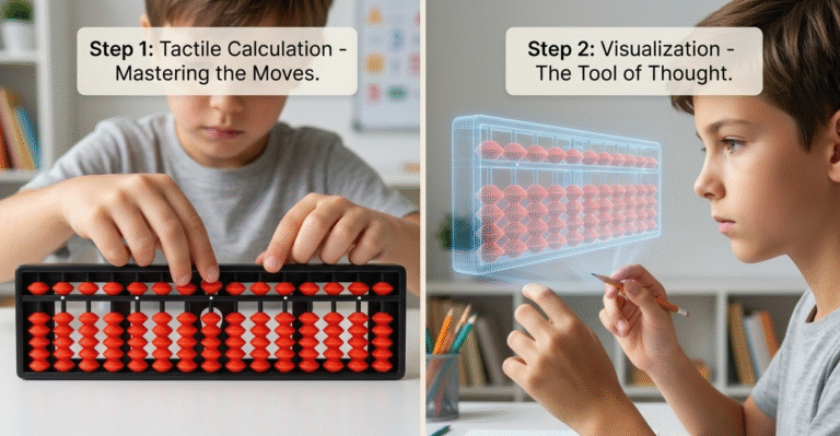 At first, kids move beads on a real abacus to solve sums. Gradually, they visualize the tool in their mind instead of using their hands. This shift – imagining moves without touching – is called mental math.
